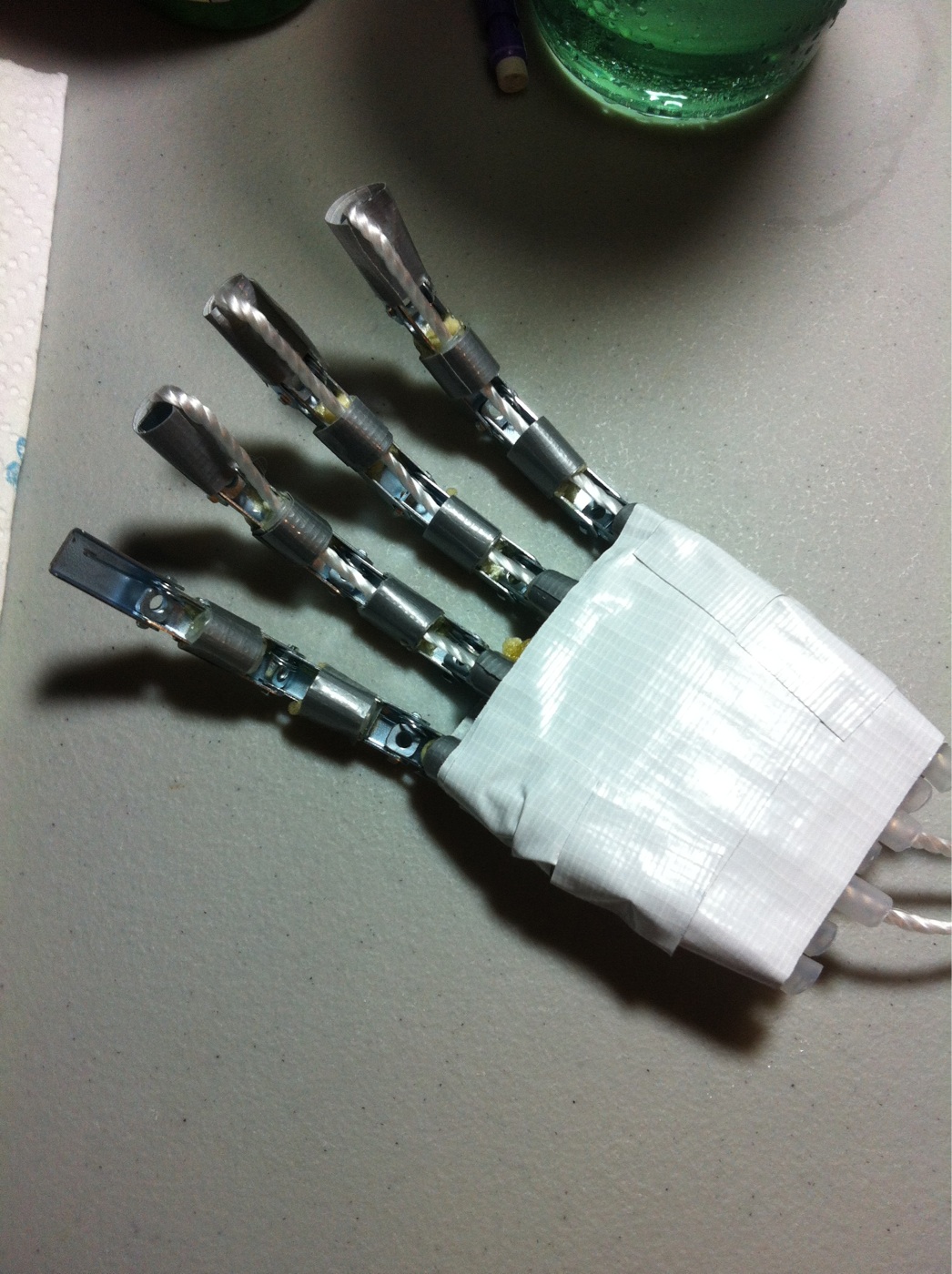 The picture cuts it off, but here’s how it works: it’s rough anatomically correct, with all the joints where they’re supposed to be. As shown is the “default” state for the hand. There’s a string that’s fixed to the end of a finger, and it is fed through the inner of the finger (the “bones” are hollow rubber tubes). The hand part is also constructed of a series of hollow tubes encased in foam, so that there is a path from the fingertip to the bottom of the hand, where the other end of the string comes out. When the string is pulled, the finger bends, and when the string is released, the finger returns to the default state. The idea is to tie the end that comes out of the bottom of the hand to a motor, and correspond servo motor pulses to the degree of finger bend. Here’s a video describing what I mean: